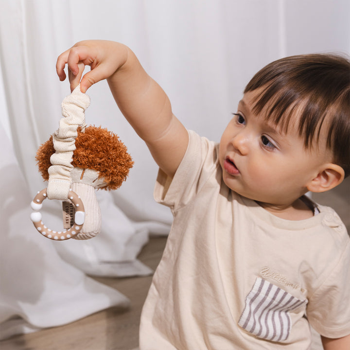 Keep your little one entertained when out and about with our gorgeous Mini Market Brunch stroller toys. Our Mushroom & Corn is made from polyester plush and features a soft rattle to enhance the play experience. They attach easily to any stroller/pram hood, bumper bar, or even baby's play-gym or car seat.