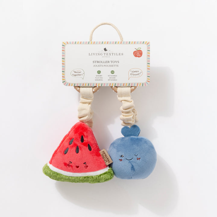 Keep your little one entertained when out and about with our gorgeous Mini Market Brunch stroller toys. Our Watermelon & Blueberry is made from polyester plush and features a soft rattle to enhance the play experience. They attach easily to any stroller/pram hood, bumper bar, or even baby's play-gym or car seat.