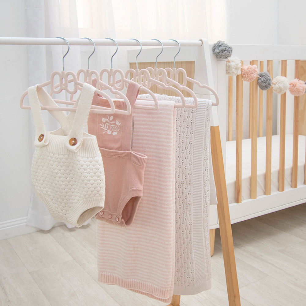 These velvet-covered baby hangers are perfectly sized to keep your baby's clothes neat and organized.