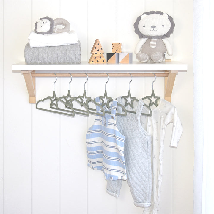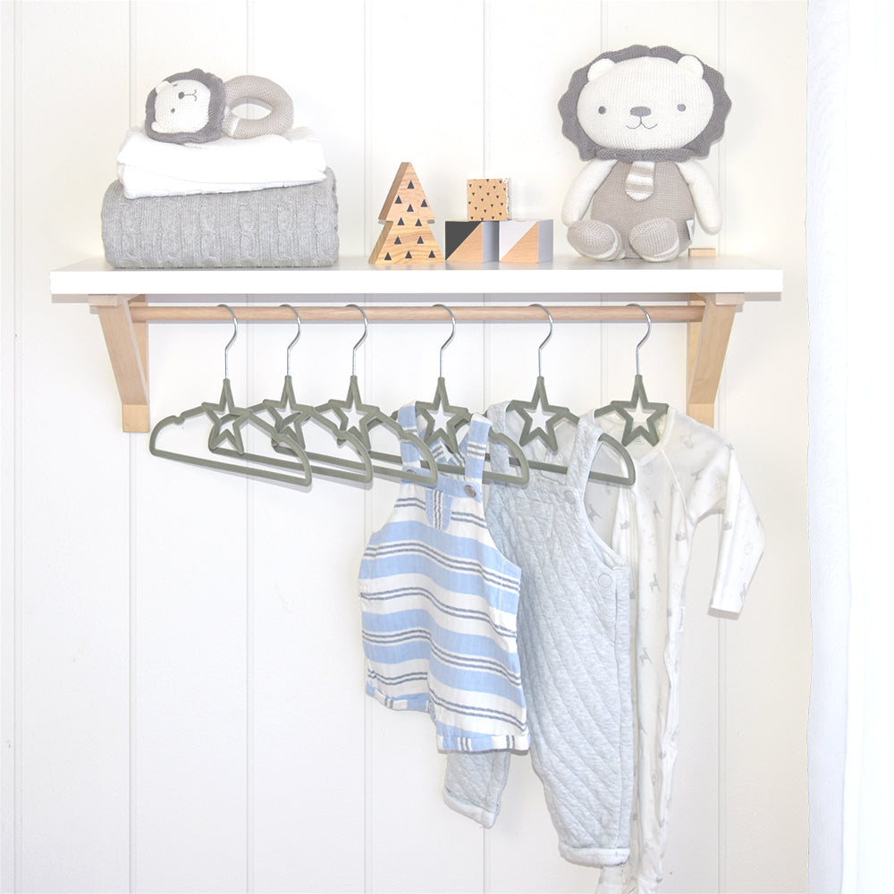 These velvet-covered baby hangers are perfectly sized to keep your baby's clothes neat and organized.