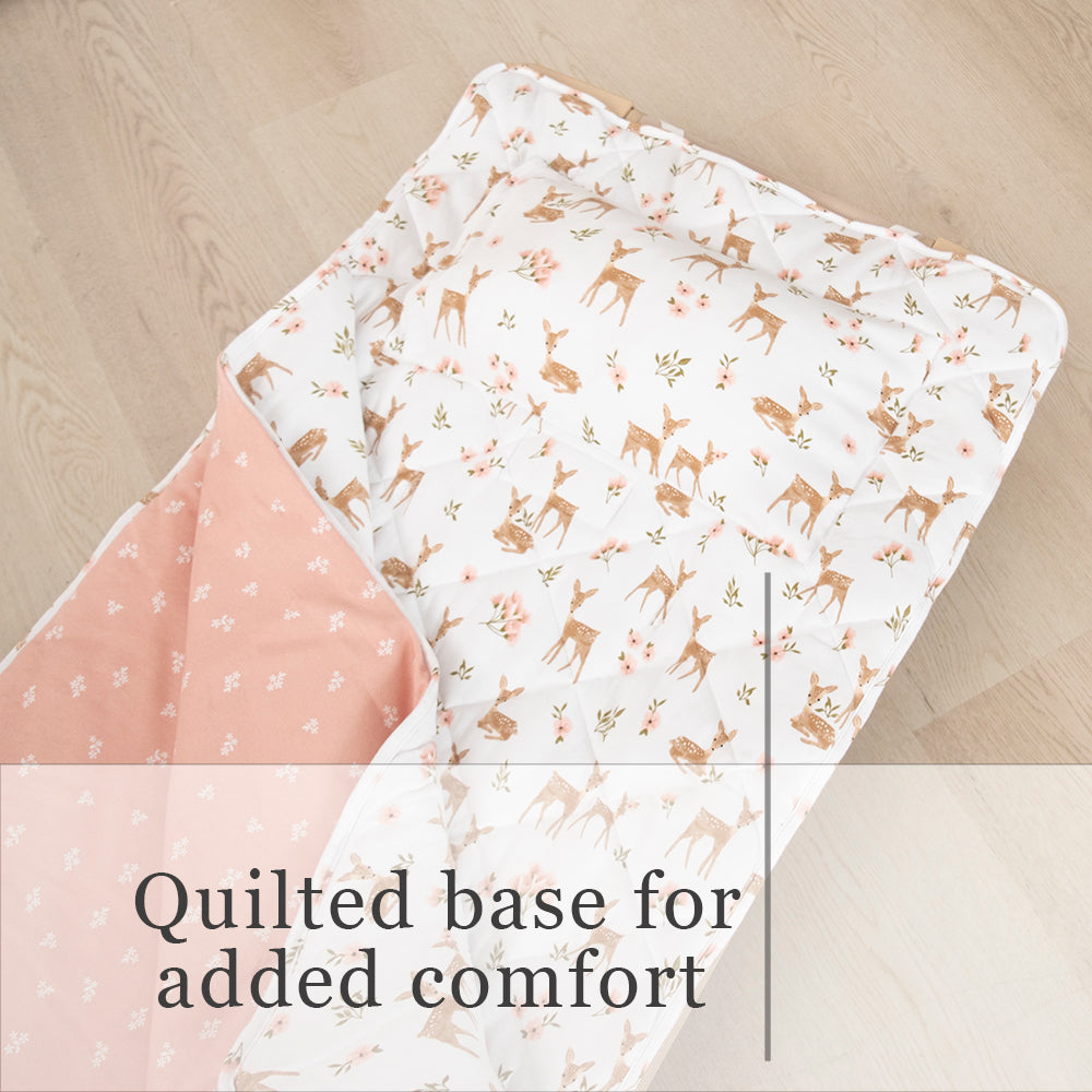 Designed with leading childcare centres, it fits daycare stacking beds perfectly with four elastic loops to keep it secure, even for little tossers and turners. Alternatively, it can be placed directly on floor mats for flexible sleep options.