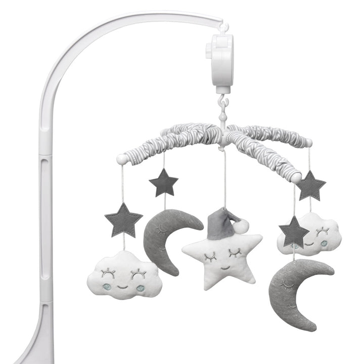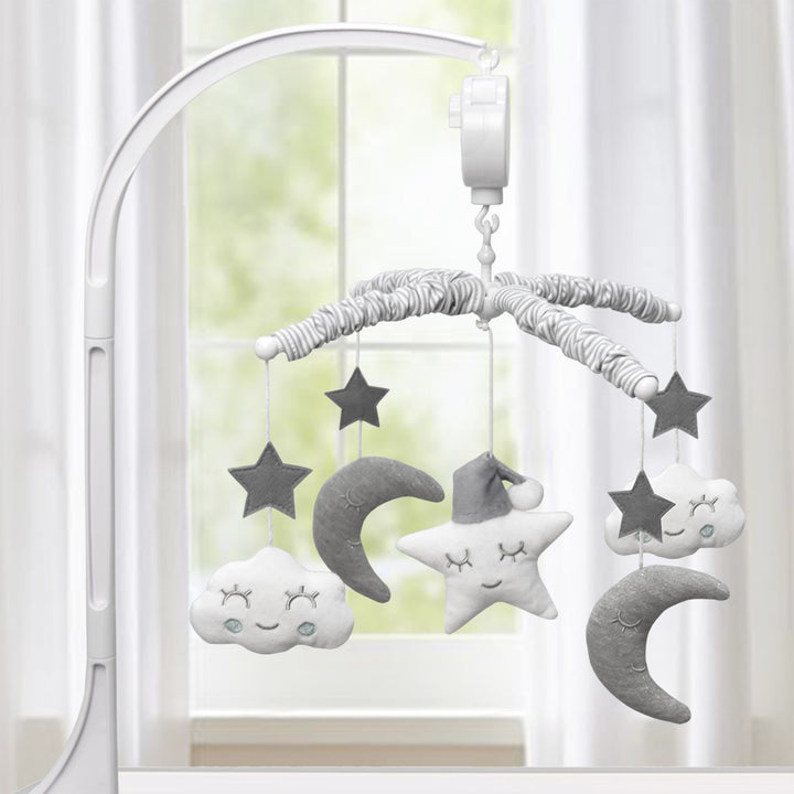Soothe and delight your little one with this sweet star and moon mobile. As it gently rotates, it plays a calming melody while soft plush stars, moons, and clouds create a dreamy finishing touch for your nursery.