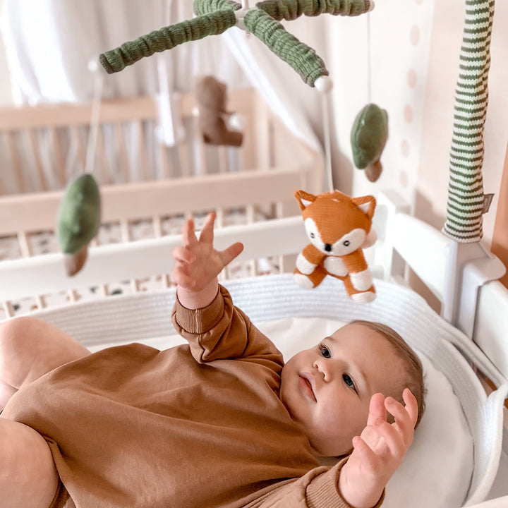 Little ones are going to love watching these adorable forest animals gently rotate overhead to the soothing tune of Brahms’ Lullaby as they drift off to sleep. With exquisite detailing, this beautiful musical cot mobile adds the perfect finishing touch to your nursery.