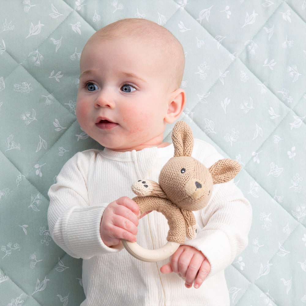 Delight and soothe your little one with our charming Kangaroo Rattle. Crafted from soft cotton knit with a handmade feel, it features a gentle jingle and a BPA-free silicone teether ring - perfect for tiny hands and growing gums.