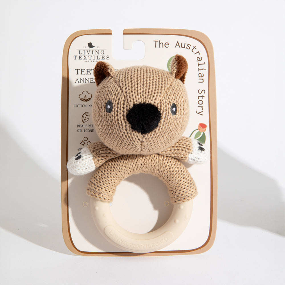 Delight and soothe your little one with our charming Wombat Rattle. Crafted from soft cotton knit with a handmade feel, it features a gentle jingle and a BPA-free silicone teether ring - perfect for tiny hands and growing gums.