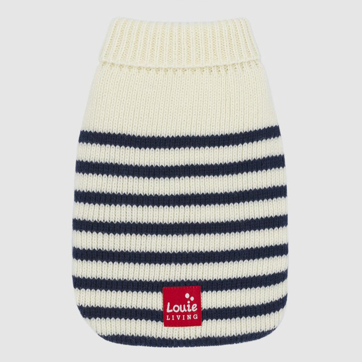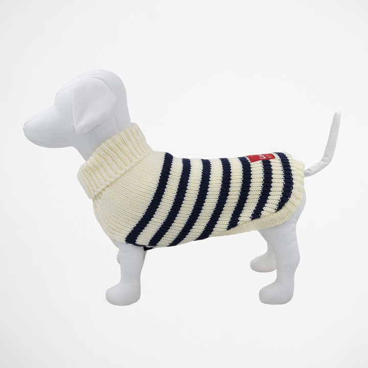 This classic navy and white stripe pull over cardigan is perfect for the discerning pup wanting to impress at the park. Carefully constructed in a stretch knit fabrication that's easy to pull over your furry friends head, the this coat allows your dog freedom of movement and won't inhibit toileting.